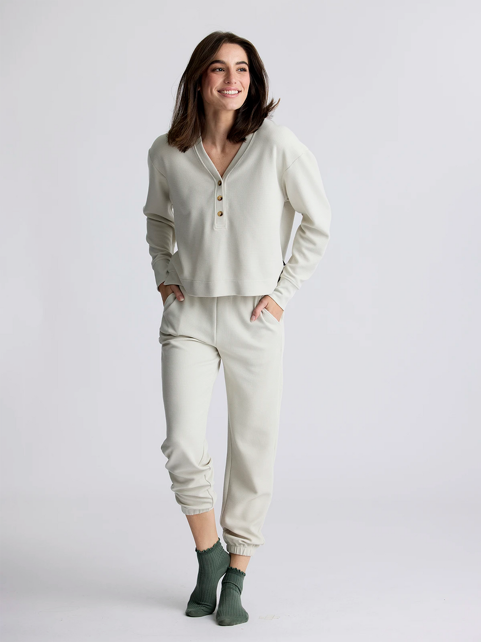 Level up your lounge game with the laidback and super comfy Waffle Long Sleeve Henley. Cropped at the perfect height to pair with any of our high-waisted bottoms, we built this henley from a luxe waffle knit that feels downright luxurious. You might put it on for breakfast, but you’ll end up wearing it through lunch, coffee, and probably late into the evening, thanks to the all-day comfort and casual, goes-with-everything style. Make it a matching set with our Waffle Jogger for the ultimate in après-adventure relaxation.